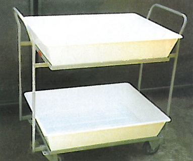 Carrello SC 1060 a due piani con due vasche di plastica e struttura in acciaio inox. A richiesta anche le vasche in acciaio inox per carni e alimenti |